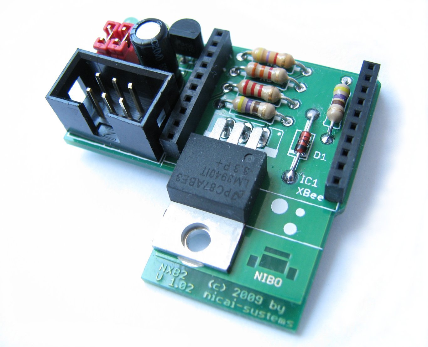 Die NXB2 Adapterplatine ermöglicht den Anschluss eines professionellen XBee® Funkmoduls an den NIBO 2. Der Roboter kann so um die Fähigkeit zur drahtlosen Kommunikation erweitert werden. Mit einer entsprechenden Gegenstation (z.B. UCOM-XBEE) können dann die vom NIBO 2 gemessenen Daten per Funk an einen PC übertragen werden.